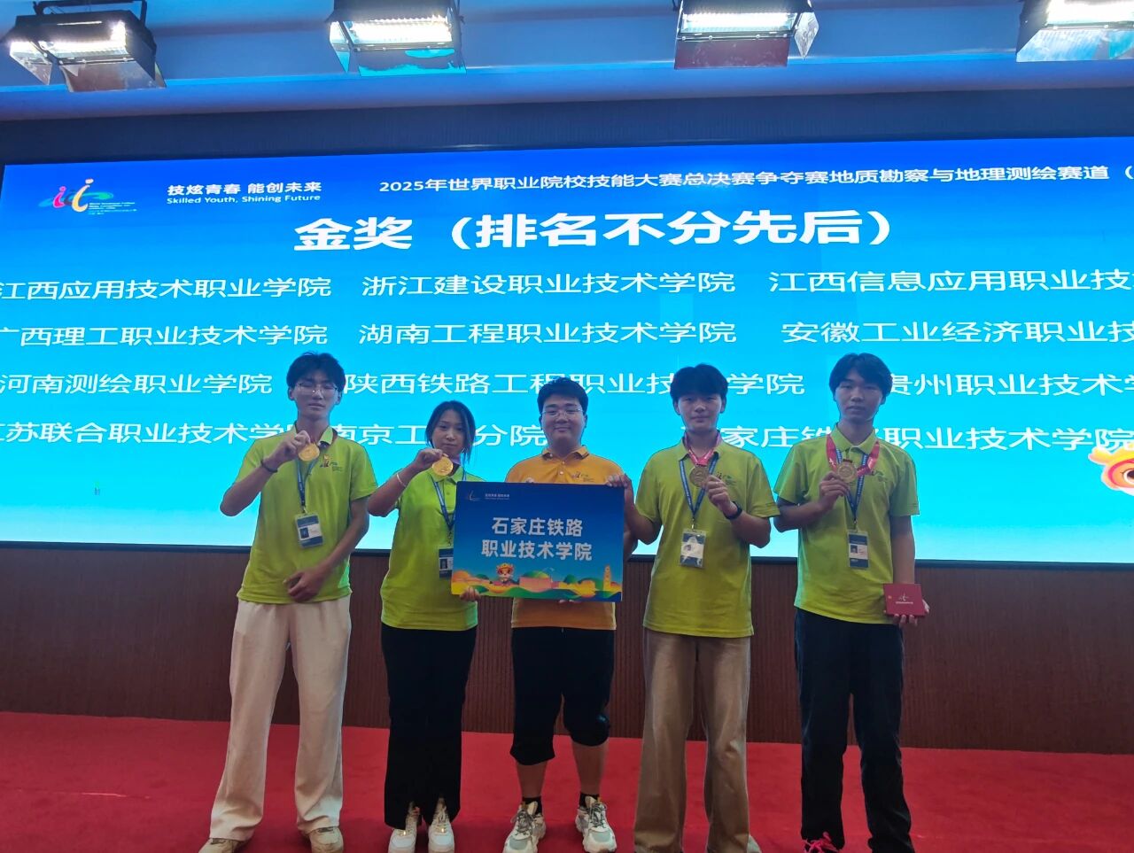 2025年8月25日至30日,世界職業(yè)院校技能大賽總決賽地質(zhì)勘察與地理測繪賽道(高職組)爭奪賽在江西應用技術(shù)職業(yè)學院成功舉行。經(jīng)過激烈角逐,石鐵院測繪工程系王政、信蘇哲、竇甜甜、張旭闊四位同學組成的參